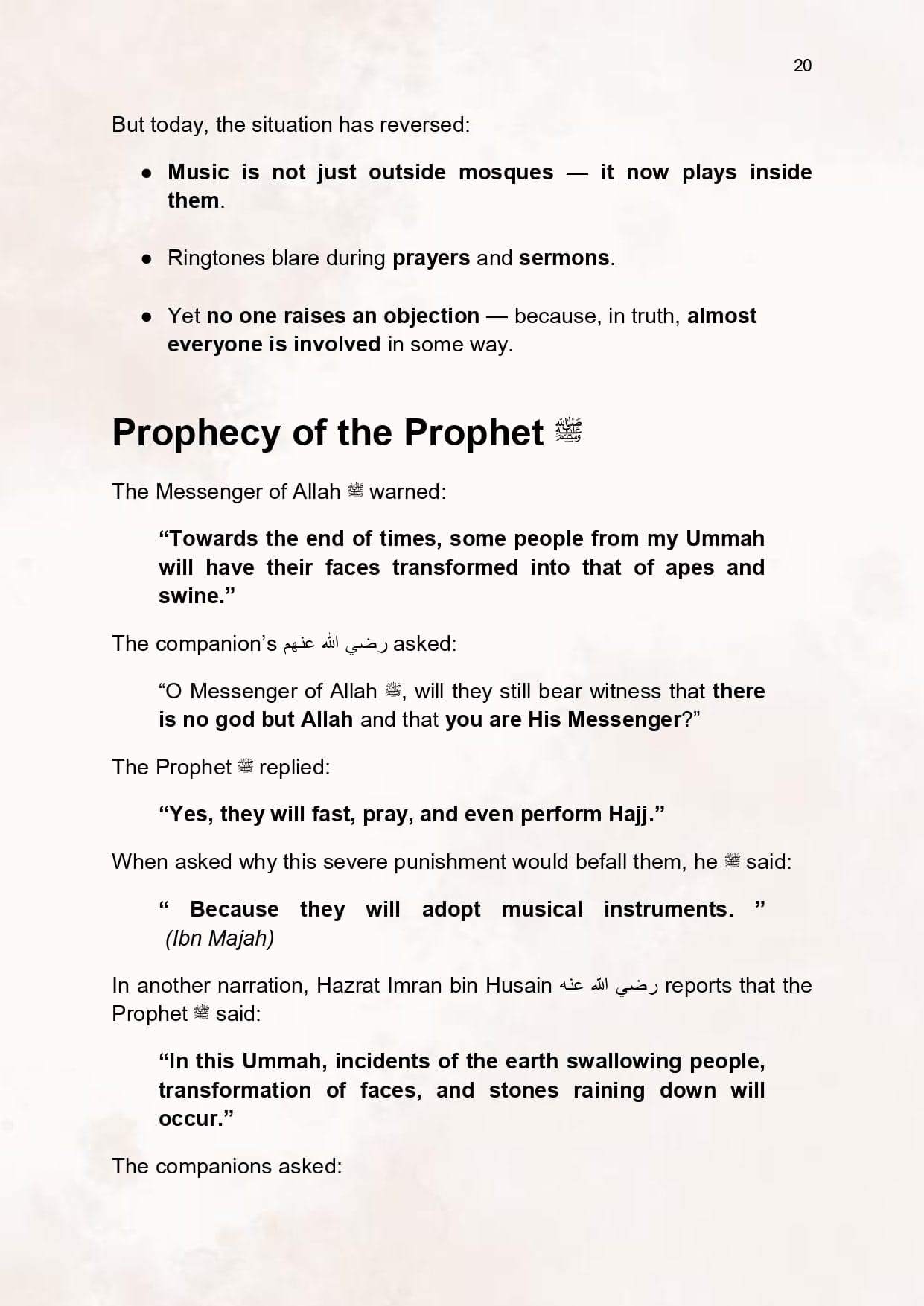 The book cites authentic Hadith and Qur’anic verses to explain the religious guidelines about technology usage, music, and maintaining the sanctity of worship.