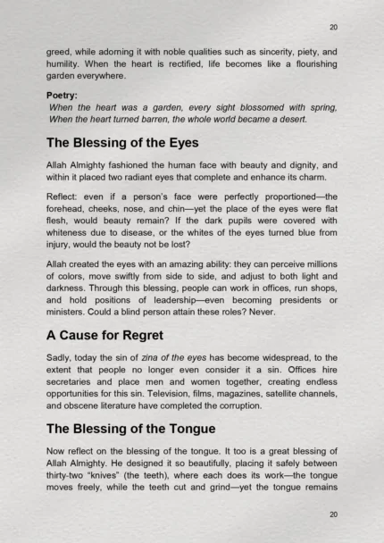 Drawing inspiration from Quranic principles, the Sunnah of Prophet Muhammad ﷺ, and the wisdom of pious scholars, the book outlines the rights, responsibilities, and character traits that lead to a strong and blessed marital relationship. It also addresses common issues couples face and provides practical solutions that help strengthen communication, trust, and emotional connection.