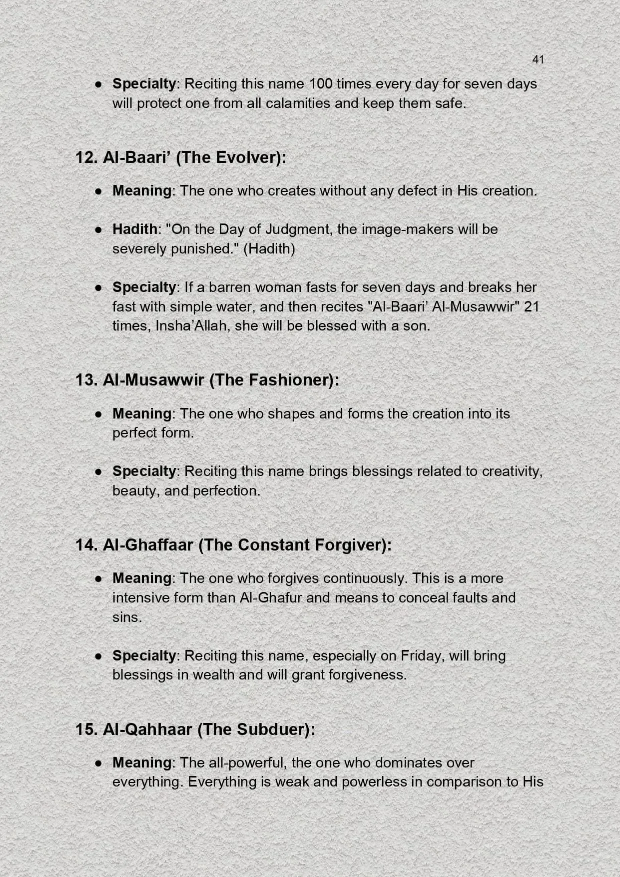 ● Al-Baqqi (The Ever-Lasting): Eternal Allah, unaffected by time; reciting 1,000 times daily protects from harm and loss.