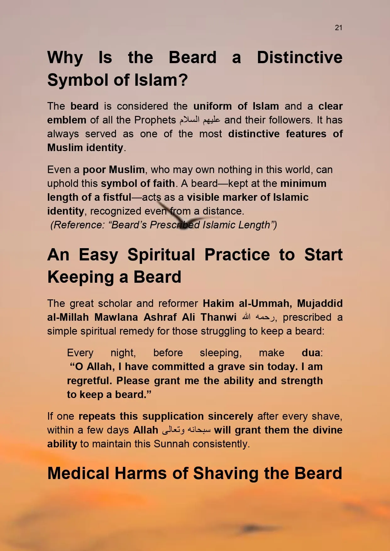 • Refutation of Modern Excuses → Addresses common excuses for shaving, such as fashion, looking younger, or social acceptance, and explains why they hold no weight in Shariah.